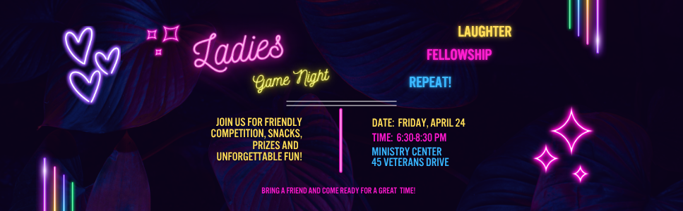 Join us for ladies game night filled with laughter, connection, and friendly competition. Come play the Friendship game and UNO Teams with us and enjoy some light refreshments and meaningful fellowship. It’s the perfect opportunity to unwind, build deeper friendships, and be encouraged alongside other women in our church community.